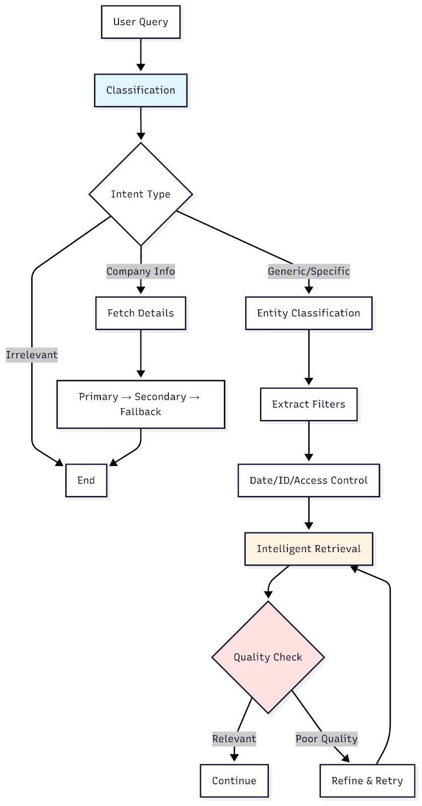 Our assistant uses intelligent retrieval strategies. When a user asks, “Show my upcoming meetings this week,” the system identifies the intent, extracts structured filters like meeting dates or company, and retrieves only the most relevant data. This prevents what we call the “Retrieval Death Spiral,” where irrelevant context snowballs into increasingly inaccurate responses.