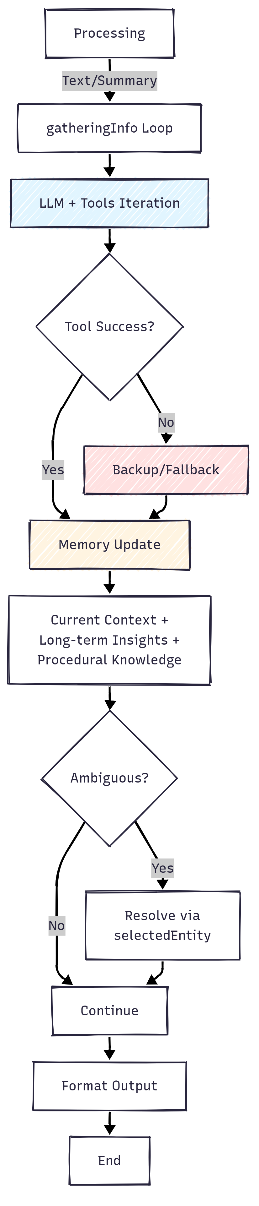 We use a hierarchical memory pattern, where immediate context takes precedence but long-term patterns and insights are efficiently consolidated. Ambiguities like “this account” are clarified instead of guessed, preventing incorrect assumptions from cascading.